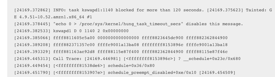 If you start seeing these errors it means your server or instance started running out of kernel memory. [10223.291166] java: page allocation failure: order:0, mode:0x1080020(GFP_ATOMIC), nodemask=(null) [10223.301794] java cpuset=/ mems_allowed=0-1 [10223.307211] CPU: 29 PID: 19395 Comm: java Not tainted 4.14.154-99.181.amzn1.x86_64 #1 [10223.315658] Hardware name: Xen HVM domU, BIOS 4.2.amazon 08/24/2006 [10223.322004] Call Trace: [10223.325230] <IRQ> …