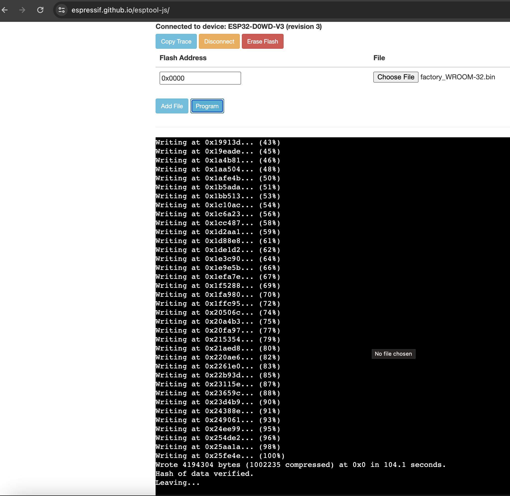 Press the “Program” button and you will see the “Writing…” logs on the console output.