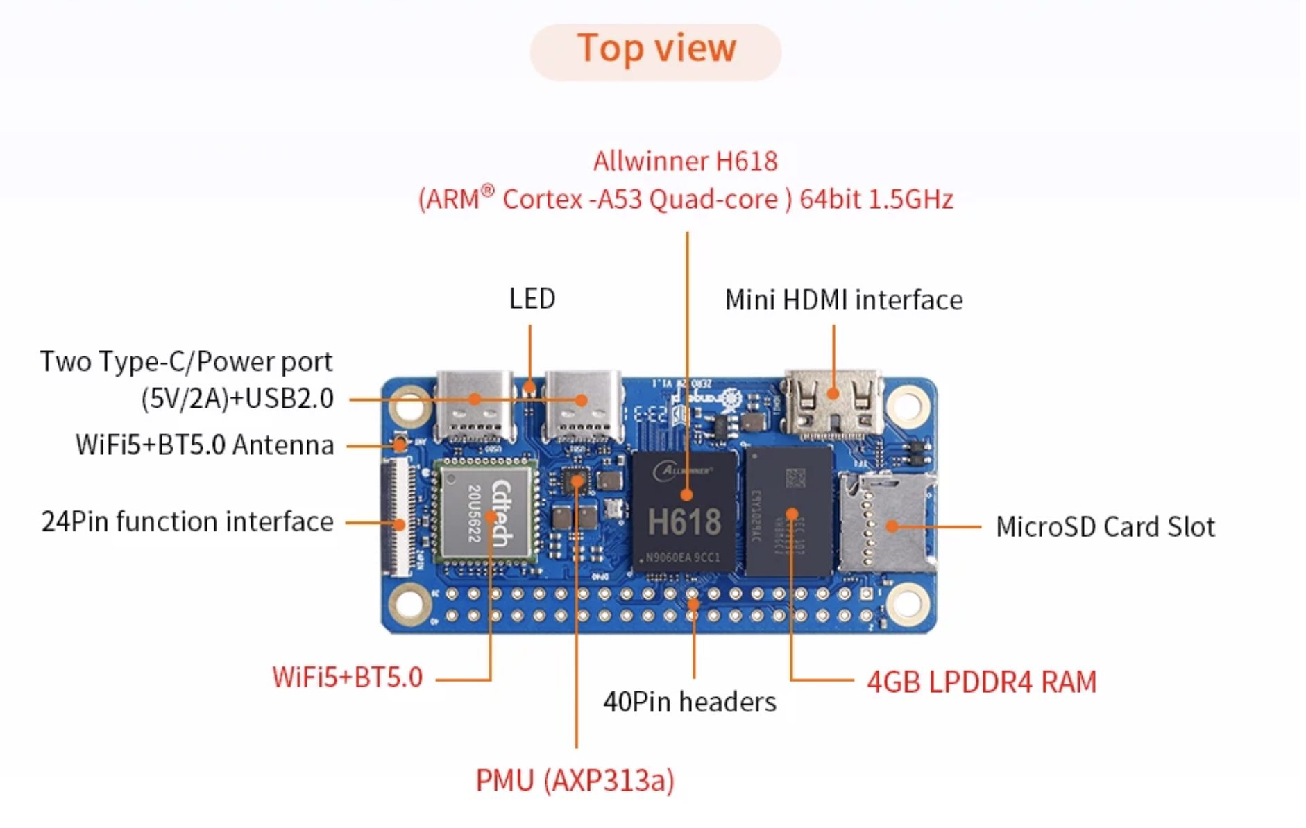 Orange Pi Zero 2W is powered by Allwinner H618 high-performance quad-core Cortex-A53 processor with up to 1.5GHz, integrated Mali G31 MP2 graphics processor, supporting OpenGL ES 1.0/2.0/3.2, OpenCL 2.0, Vulkan 1.1. It has 1GB /1.5GB / 2GB /4GB LPDDR4 memory specification options, supports 16MB SPI Flash, has Wi-Fi5, BT5.0.