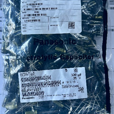 This pack includes six Panasonic FM Series 330µF 35V Electrolytic Capacitors. With low ESR, high ripple current capacity (1190mA), and a lifespan of up to 5000 hours at 105°C, these 10x16mm radial capacitors are designed for filtering, decoupling, audio, and LED applications in 12V–30V systems. Pacific Custom Engineering provides authentic Panasonic components for repair or circuit use.
