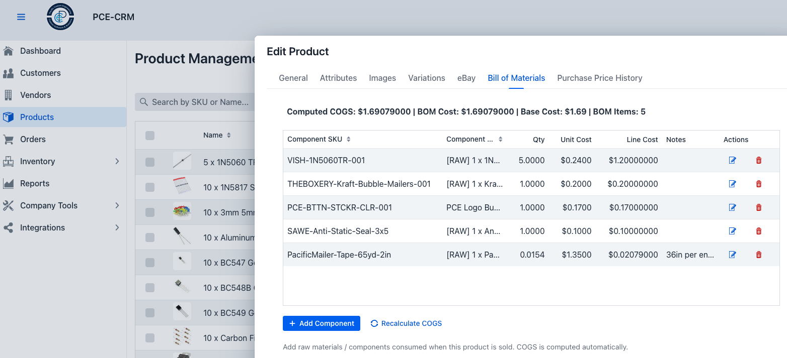 • Bills of Materials (BOM) and Cost of Goods Sold (COGS) — define product assemblies, specify components and quantities, and automatically calculate true material, labor, and overhead costs for accurate pricing, margins, and quoting.