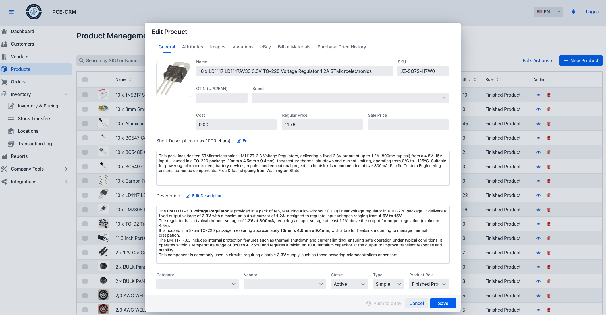 • Product Management — Track inventory across multiple locations with SKUs, vendors, stock levels, descriptions, and visual support through main + additional image uploads.